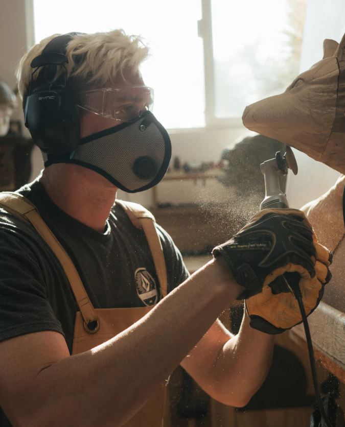 Woman woodworking while wearing M1 Neoprene RZ Mask